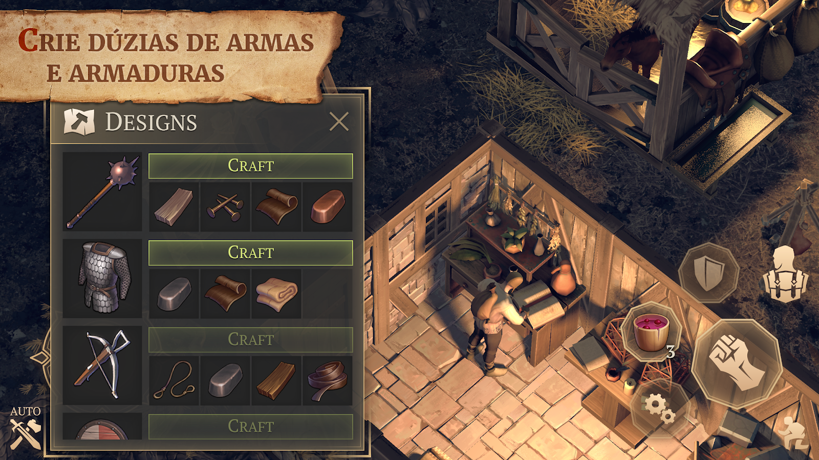 Construa bancadas de trabalho e crie novos recursos. Descubra novos designs e crie armas e armaduras medievais realistas para combater os habitantes mais perigosos das Terras Pestilentas.